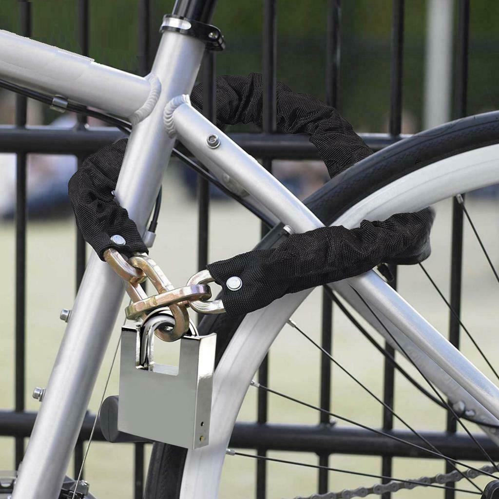 1.8M professional quality Heavy Duty Chain and Pad Lock Suitable for a wide range of other security applications Protective textile outer sleeve protects paintwork and rims Security grade metal chain with reinforced fabric to protect the wheels. The chain will be protected and last a long time thanks to a protective cover that is water-resistant, waterproof, dustproof, and anti-friction.